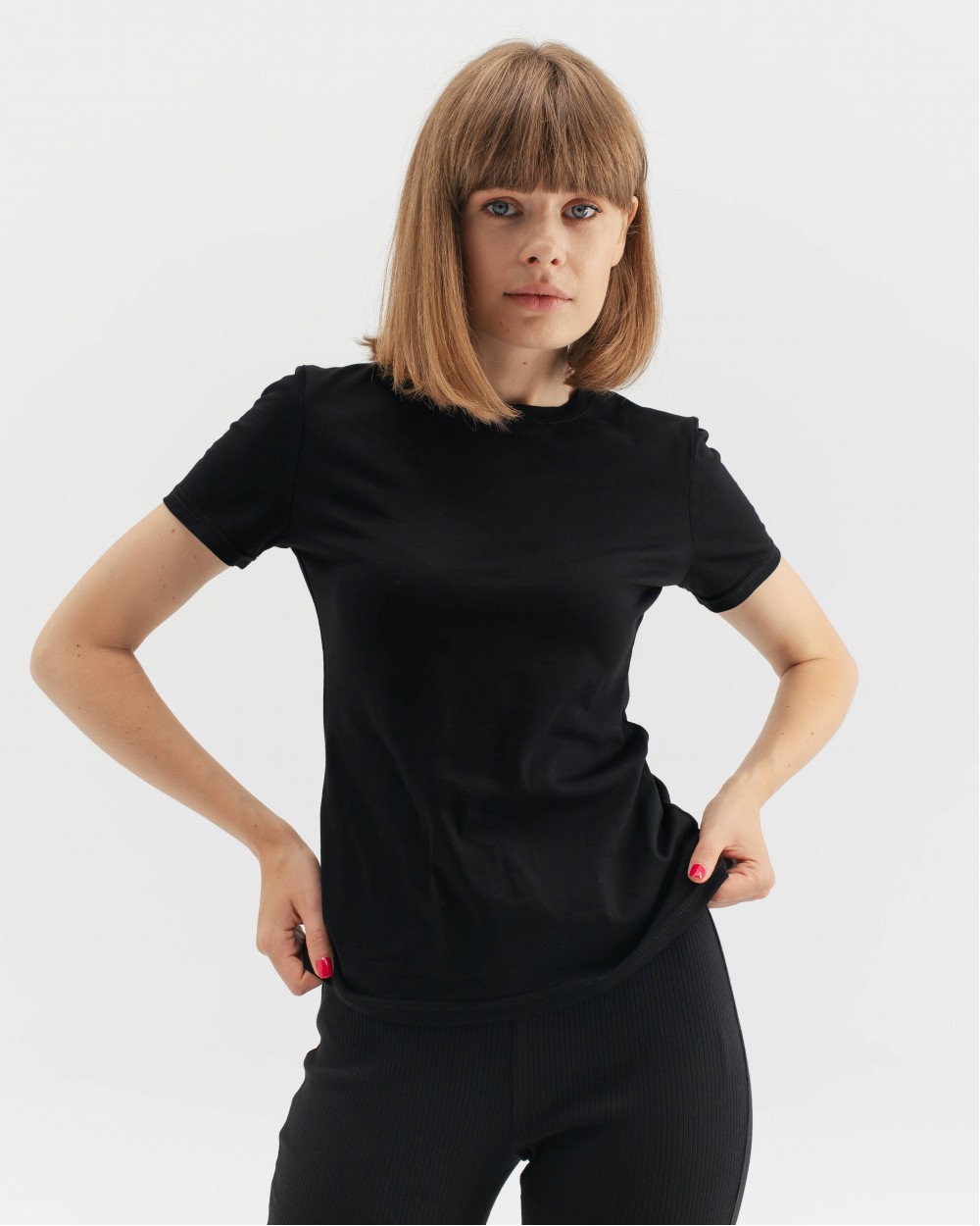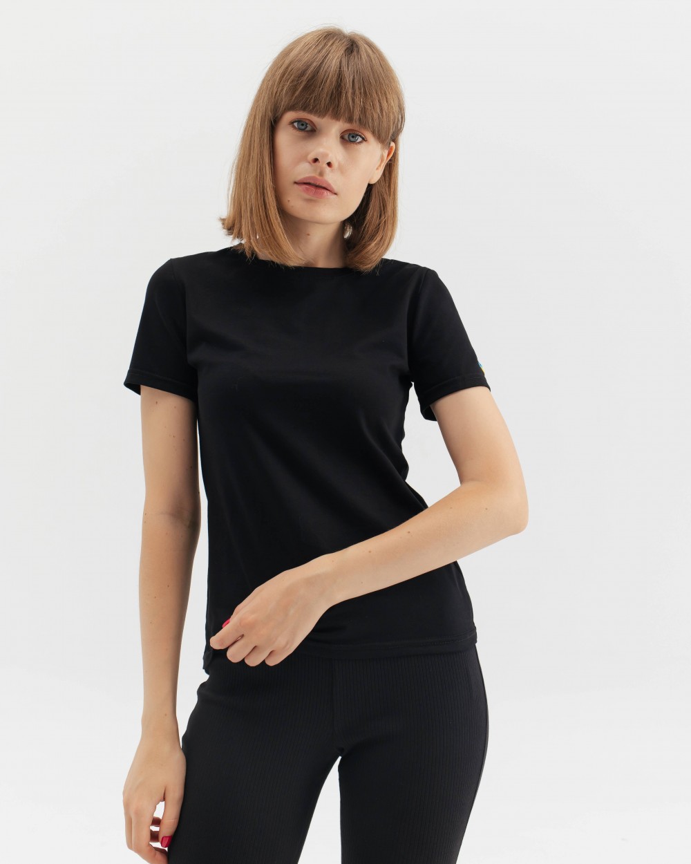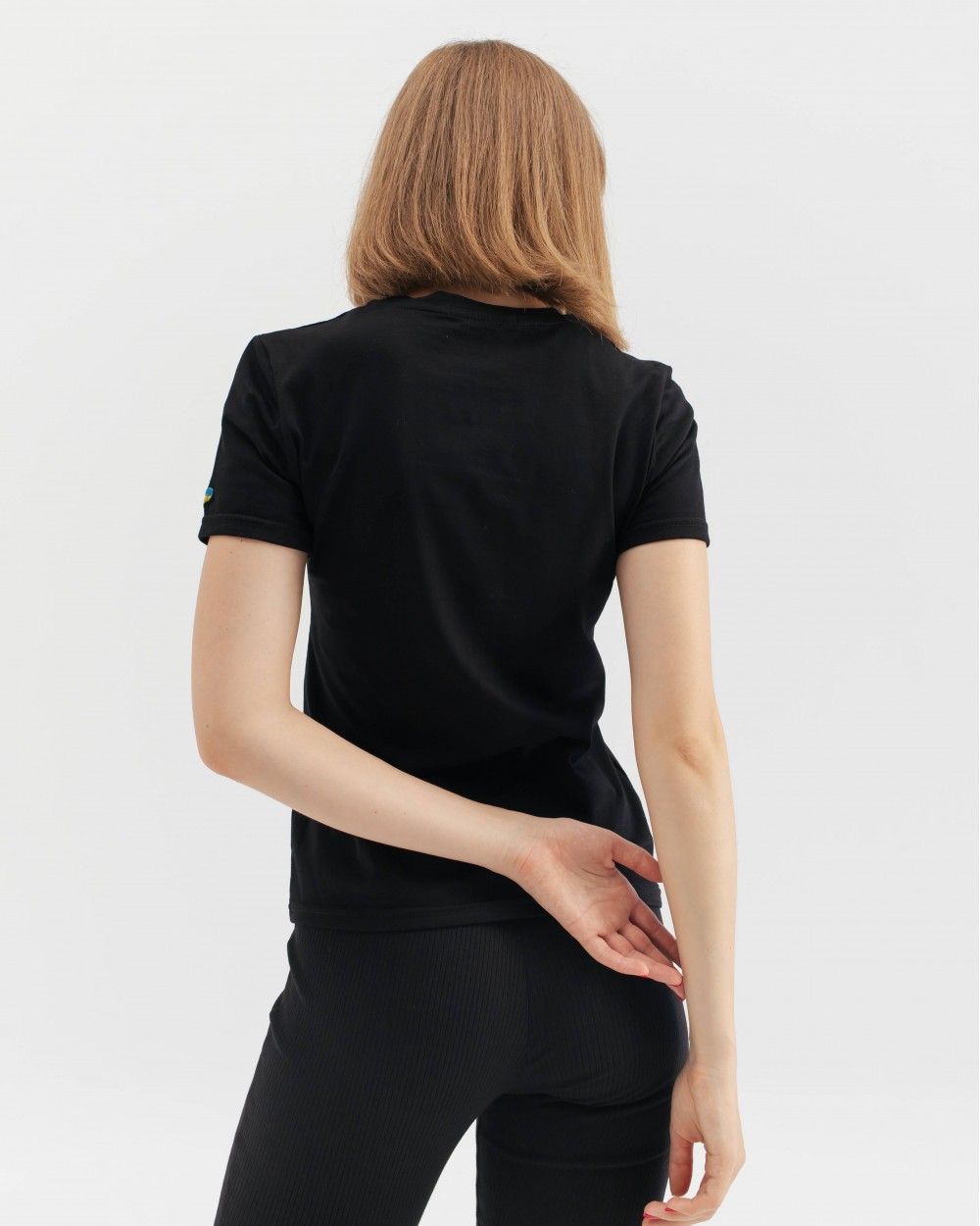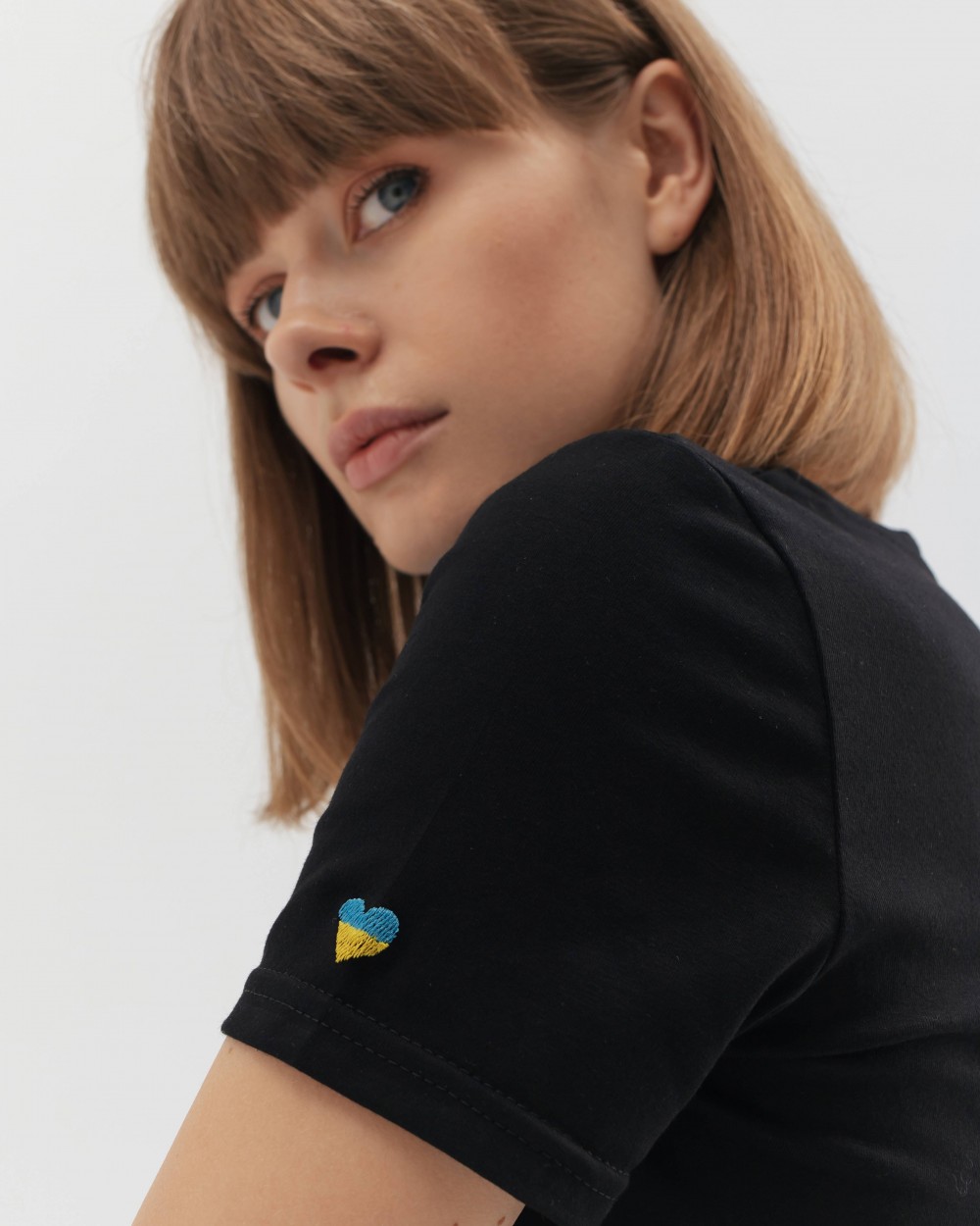 Базова чорна футболка напівприталеного крою з круглим вирізом і короткими рукавами. Виготовлена з натуральної бавовни. На рукаві - мінімалістична вишивка серця жовто-блакитного кольору.